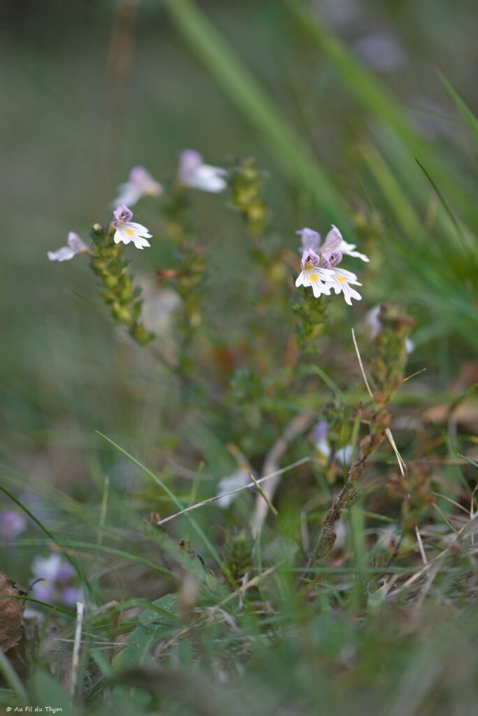 Juste à côté des petites euphraises officinales révèlent leurs fleurs à pétales découpés, blanc en bas, violets au dessous.