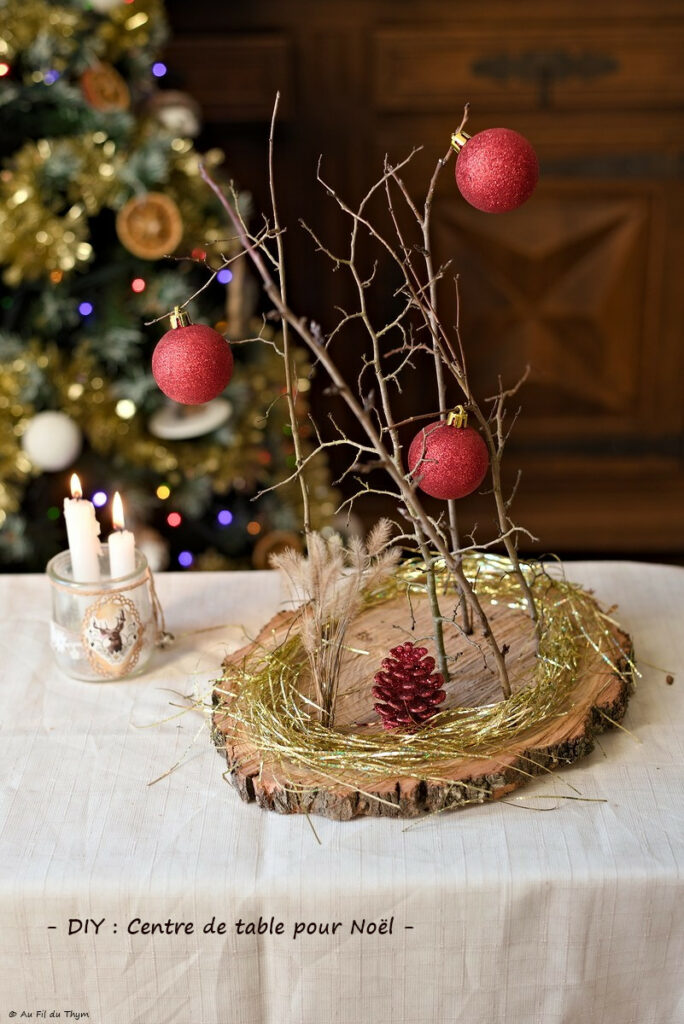 - Répartissez vos décorations de noël dans les branchages ou sur le sol du centre de table. Pour ma part j’ai opté pour