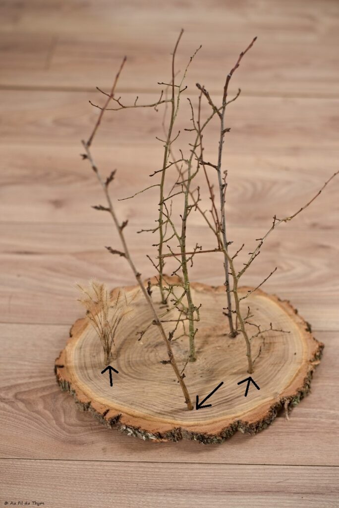 - Pour les branches, privilégiez des branche d’arbres ou arbustes assez droites et dures (prunier, orme, aubépine). Évitez les branches pliables facilement (cornouiller…)