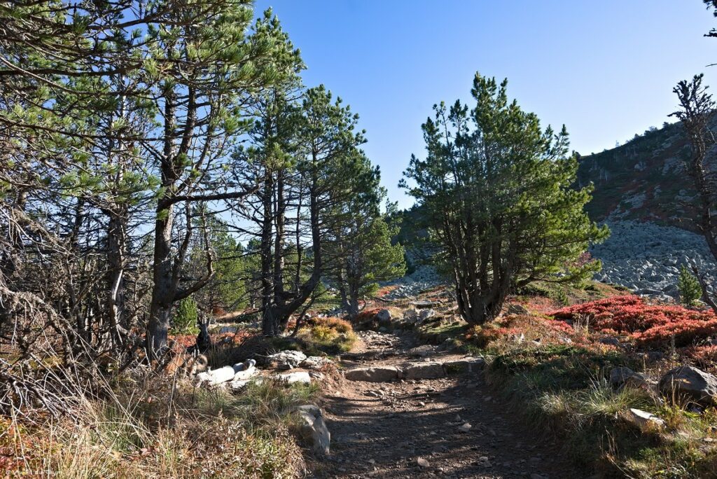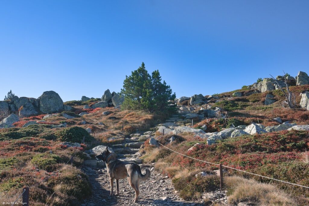 Nous arrivons sur les derniers mètres d’ascension. le chemin de pierre s’étend entre les tapis de myrtilliers, de pierres, de genévrier