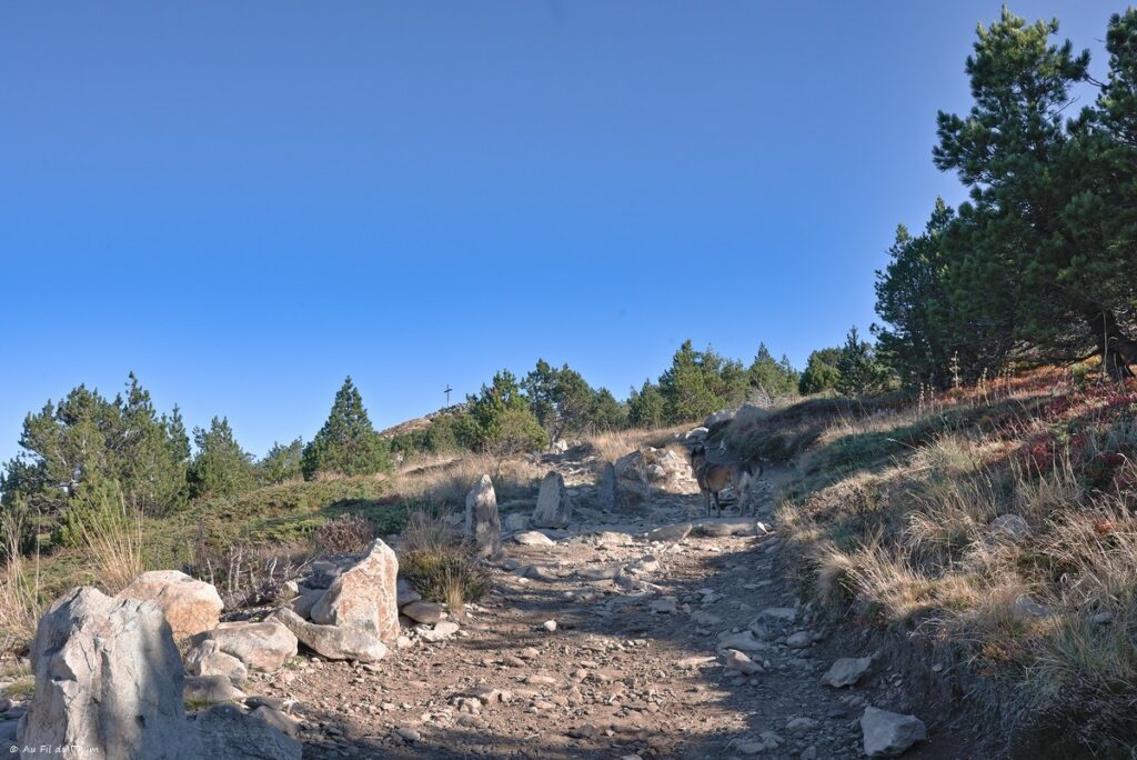 Partir en milieu de matinée, alors que le soleil est encore bas à l’horizon. Nous attaquons au niveau de la croix de Peccata par une zone de forêt aménagée.