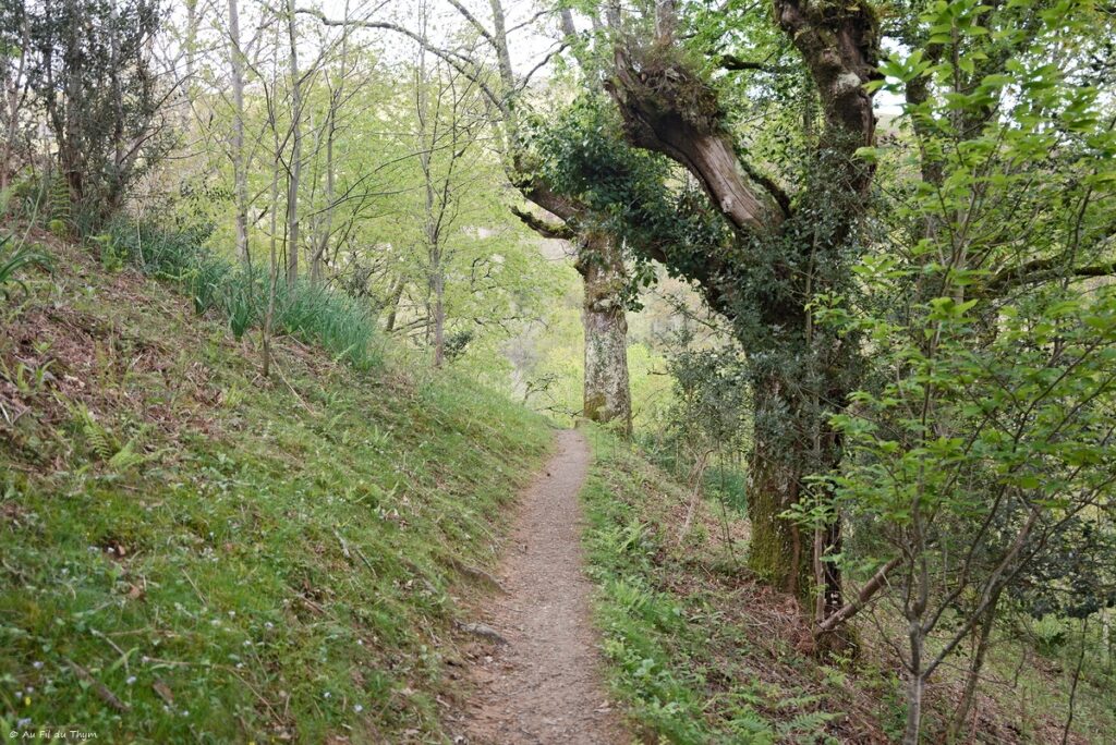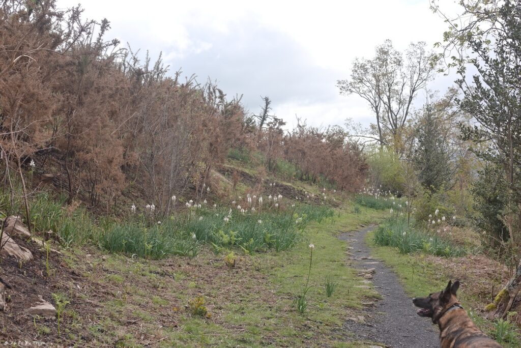 Nous continuons la descente et repassons en forêt. Retrouver la gaieté des arbres et des asphodèles (en blanc) fait du bien.